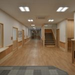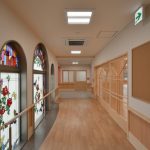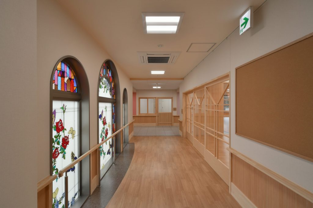 従来型特養からユニット型特養への改築です。特養80床、ショートステイ10床で構成しています。既設建物で使用されていたステンドガラスの再利用や、内装の木質化など、温もりある施設としています。