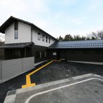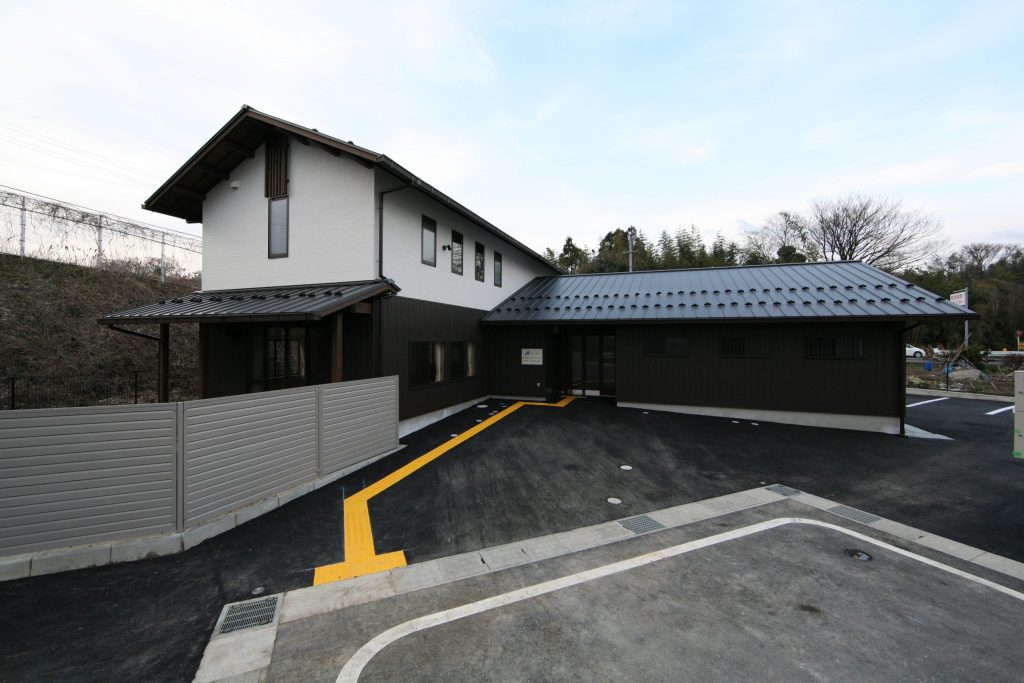 【外観】屋根は切妻屋根、外壁は腰部を古民家調、上部を白壁調することで利用者にどこか懐かしく親しみやすい外観とし、一方で、妻部にはアクセントに木製格子を設け、サッシをリズミカルに配置することでモダンな外観となっています。