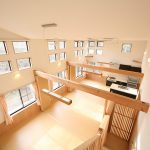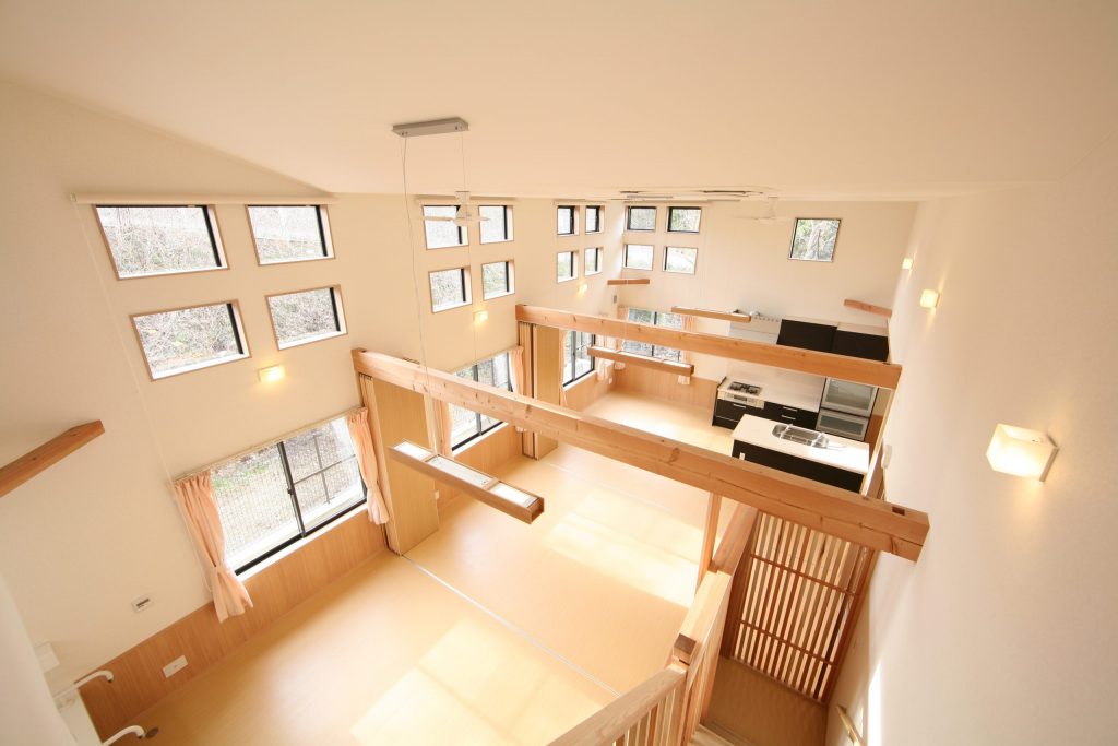 【事務室】2階の事務室からは、吹抜けより1階の居間を見渡すことができます。職員が2階にいるときでも1階の様子がわかるため、目の行き届いたケアを行うことができます。